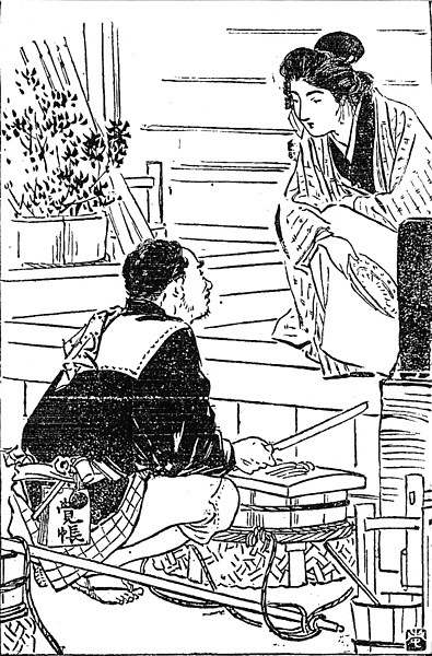 | キーワード | 寺の勝手口;魚屋;筒袖;三尺帯;肩当て;ぞうり;覚え帳;天秤棒;御前籠;盤台(ばんだい,はんだい);まな板;刺身包丁;住職の女房;黒襟;梵妻(だいこく);大黒 |