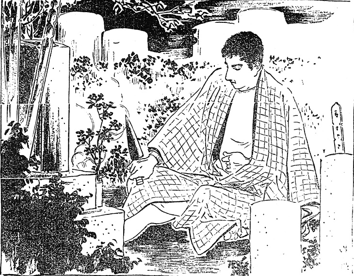 説明 刑期を終えて出所した男が、誓った女の墓前で自殺する。切腹の作法、仕方もいろいろあるが、もとよりやくざ者のことだから、そんなことに拘泥はしないだろう。形ばかり腹に突き立てたあと、すぐに頸動脈を切断するのが楽な方法とされ、女性の場合は腹に刺すことはしない。(大丸 弘)