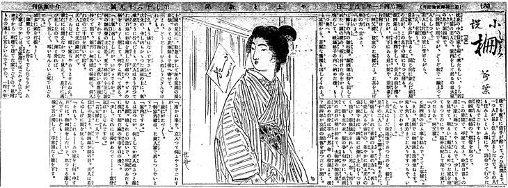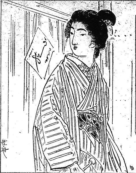 | 説明 | 第1回,第2回は、独り住まいの貸家を探している最中の主人公。この女性の丸髷の髷の大きさは、年増女の、つまり丸髷ほど色っぽい髪はない、と言われる年頃にふさわしい。前髪が小さめなのは明治風で、こののち大正・昭和と前髪がずっと大きくなったことで、形は整ったものの、色気、と言われたやさしさは薄れたかもしれない。この女性は下町の豊かな商家の娘だが、その美貌が仇になって身持ちが治まらず、男から男と転々としながら、しかし肌身を許すことは決してない、という不思議な女性。作者は美貌美貌と繰り返し言っているが、この挿絵によって、読者に本当にそれを納得させられたのだろうか。[やまと新聞]の挿絵は父親の関係から鏑木清方も長いこと担当し、この時代にはあの伊東晴雨が在社していたのだが、この作品は、新聞の挿絵よりも、雑誌の口絵のほうで知られている「暁舟」の署名入りである。(大丸 弘) |