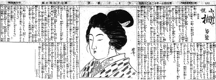 | 説明 | 第1回,第2回は、独り住まいの貸家を探している最中の主人公。この女性の丸髷の髷の大きさは、年増女の、つまり丸髷ほど色っぽい髪はない、と言われる年頃にふさわしい。前髪が小さめなのは明治風で、こののち大正・昭和と前髪がずっと大きくなったことで、形は整ったものの、色気、と言われたやさしさは薄れたかもしれない。この女性は下町の豊かな商家の娘だが、その美貌が仇になって身持ちが治まらず、男から男と転々としながら、しかし肌身を許すことは決してない、という不思議な女性。作者は美貌美貌と繰り返し言っているが、この挿絵によって、読者に本当にそれを納得させられたのだろうか。[やまと新聞]の挿絵は父親の関係から鏑木清方も長いこと担当し、この時代にはあの伊東晴雨が在社していたのだが、この作品は、新聞の挿絵よりも、雑誌の口絵のほうで知られている「暁舟」の署名入りである。(大丸 弘) |