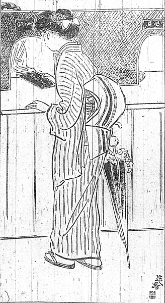 キーワード 銀行;窓口;後ろ姿;リボン;お太鼓結び;ぞうり