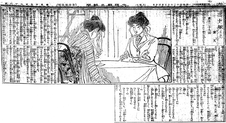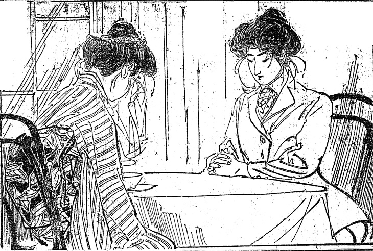 キーワード 和装と洋装の対比;和装に庇髪;洋装に庇髪;後れ毛;テーブルの上で手を組む;椅子