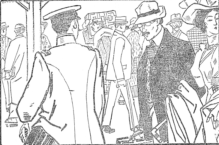 説明 末期の清朝と日本をめぐる大仕掛けなロマンの冒頭。「軽いアルパカの旅行服に、本パナマの前廂(庇)(ヒサシ)を垂らして、手には膝掛と中形の革鞄(カバン)を持っている」という衣裳付けに忠実な挿絵。南米パナマ産のパナマ帽はこの頃世界的に人気が高まり、かなり高価になっていたから、台湾やフィリピン産が多かった。パナマには独特の薄黄色い色があり、それだけで紳士らしさを示せた。この文章では鞄を革鞄と書いている。革製の舶来の物入れを革包と表現したのは1870~1880年代のことだったから、この時代ではやや古めかしい言い方。同伴の女性のための、車中の膝掛を手に持っているのは外国生活の経験をもつ紳士らしい。連れ立っているヒロインの女性は上海育ちの中国人で、同時代の欧米のファッションそのまま。欧州大戦後には日本女性の洋装がにわかに話題になったが、それに対してこの時期の日本女性が洋装と縁がなかったのは、同時代の欧米の、こうしたスタイルを見ればむりもなかったと、だれしも納得するだろう。(大丸 弘)