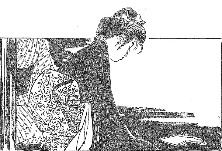 | 説明 | 当年数え十七歳になる娘。東京でも上から数えて一桁台の位置という富豪の令嬢で、華族女学校在学中。第5回,第6回は両親、兄等を避暑に送ったあと、大勢の召使いに囲まれての一日。「評判の美人の上、学問は優れて好く出来、性質の善良な(……)」という理想の女性。狭い額に太い眉、やや吊り上がった一重瞼の眼、受け口の小さな唇、という浮世絵美人の約束は変わっていないが、どこやらに人間味の感じられるのは、ふっくらした面ざしのせいか。髪は二百三高地風に髷の盛り上がった廂髪(庇髪)(ヒサシガミ)の束髪、娘らしくリボンを飾っているが、油気のないため乱れ毛の多いのはやむをえない。第18回は零落している伯父のもとを訪ねた折のすがたで、髪型は変わらず、きものは涼しげな白柄の単ものから、折り目の正しい御召かなにかの外出着になっている。(大丸 弘) |