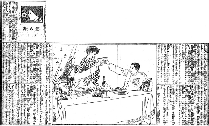 | キーワード | 西洋料理店;祝杯を挙げる;陸軍中尉;軍服;勲章;大庇髪;しぐさ;袖口を口に当てる;テーブル;テーブルクロス;椅子;コンポート;洋皿;グラス;カスターセット;花瓶;カーテン |