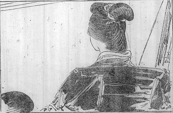 | 説明 | ひとの情事に首を突っこんで快しとするような種類の女。いま車を急がせて悶着の現場へはせ参じようとしている。女の身分はひとの妾。はなしの筋には関係ないが、三十前後の年増の丸髷が精密に描かれている一例。妾という身分は人妻に準ずるから丸髷を結うのがふつうだが、ひとの世話になっているのを隠しているような若い女であると島田に結って娘風にしていることもある。そんな顧慮の必要ないのが銀杏返しで、人妻でも娘でも結えたが、この時代の男にとって丸髷は実に色っぽいものだったらしい。丸髷の髷は新婚時代は極端に大きくそびえ立つようだが、この女の程度になるとむしろ大人の色気のあるもの。こういう水商売の女の髱(タボ=後ろ髪)はぐっと下がっていて、襟の中にめり込むよう。抜き襟の必要がよく理解できる。(大丸 弘) |