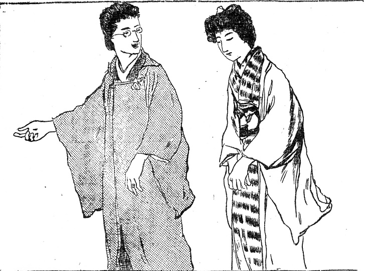 | 説明 | 母親に導かれてお見合いの席に臨む娘。場所は広い自家の庭。この日の仲人役は娘の両親だが、父親も母親もふたりをかんたんに引き合わせたなり、邸内の亭に置き去りにして早々に立ち去ってしまう。母親がいちばん外に着ているのは被布。被布も羽織同様、家の中でも外でも区別なく用いられたから、和装のこの姿は、畳の上を歩いているのか、旅先で駅のホームを歩いているのかわからない。母親も娘も束髪。娘の髪には小さな髷の脇にリボンが見えている。洋画家の渡部審也の描く人物は、生気のない浮世絵式人物とはちがうが、線描がごつごつしていて、きものを描いても木彫りのよう。(大丸 弘) |