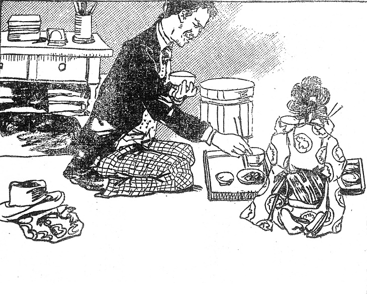 | キーワード | 食事;客膳の盆;おひつ;机;貨物船の船長;中折帽子;中折れ帽子;モーニングコート |