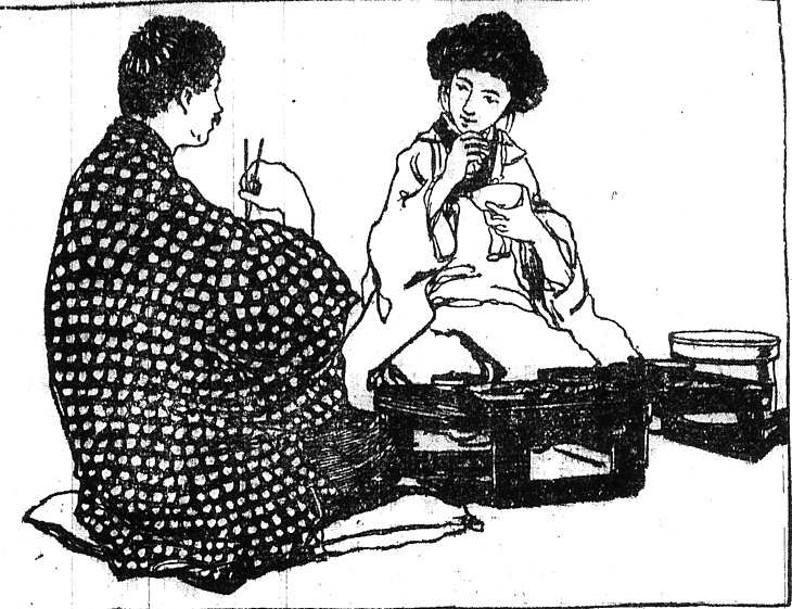 説明 育ての親、にせの親、仮の親などと話はややこしいが、この場面には関係ない。一緒に朝食を摂っているのはこの家の主人と、一夜をともにした若い女。男は紺飛白のきものに紺飛白の羽織を着ているが柄はちがう。家でのふだん着にも改まった機会以外の外出にも、紺絣くらいとりわけ若い男のきものとして広く用いられたものはないから、柄も多様で、木綿ではあっても中には本薩摩絣のような、かなり高価なものもあった。女の着ているのは被布。被布は羽織と同じように家の内外で着られたが、このころからだんだん廃れている。肩口に、小襟という三角形の襟が覗いているのが、コートとはちがう被布の特徴。頭は大きな廂髪(庇髪)(ヒサシガミ)の束髪。(大丸 弘)