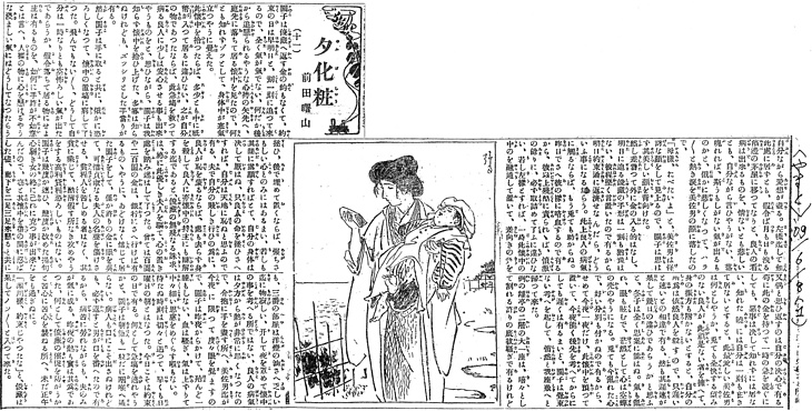 説明 差し迫った金策に窮している人妻が、偶然にずっしり重い財布を拾って悩んでいる姿。よだれ掛けをして大黒帽子を被された子どもは、足をばたつかせている。片手で抱えているにはちょっと大きすぎるようだ。大黒帽子は赤ん坊の帽子として昭和の初め頃までよく見かける。たぶん、縁起を担いでのことだろう。(大丸 弘)