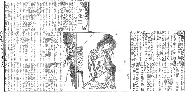 | 説明 | 悩んでいるヒロインの人妻。大黒帽子を被った幼児の手を引いているのは、知人に二百円という大金を借りようかどうしようか、それを迷っているとき、次の挿絵のランプのかたわらでは、嫌な男に迫られているとき、三番目の、立ち木を背にしているのは、「忌まわしき獣欲の犠牲になって操を汚され」、死のうかどうかと思い悩んでいるとき。一,二日の間のできごとで、いずれもハンカチーフを前歯で咬んで下に引っ張っている。以前だと襦袢の袖口を咬む場面だが、外では、ことに歩きながらではそれはなかったろう。(大丸 弘) |
