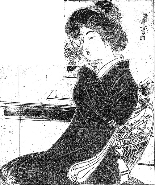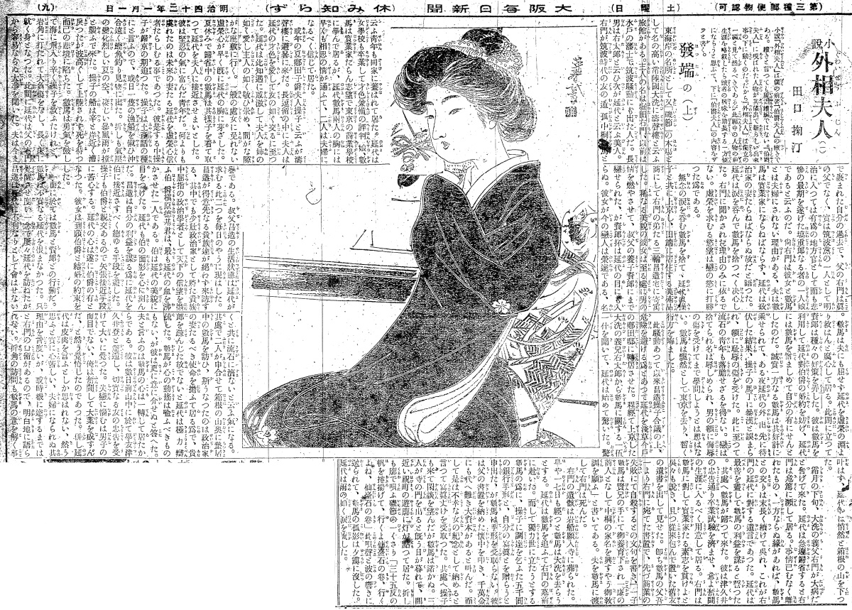 説明 この作品は田口掬亭の前作『伯爵夫人』を承けてのものなので、発端のこの回では前作に続く主要キャラクターの紹介。この女性は常陸国大洗のある旅館の娘として生まれたヒロインで、「稀なる美貌」で才色兼備、かつ栄達に憧れ虚栄に満ちたヒロイン。この旅館に養われていた、主人の亡友の忘れ形見の青年と将来を約束していたのだが、人一倍の虚栄心からより栄達を求めて、東京の某伯爵に近づこうとしている。『金色夜叉』に共通する点もあるが、「虚栄を求める欲望は恋の欲に打ち勝った」などというように、女性としてはめずらしい社会的地位への渇望、という点がダイヤモンドの光に眼のくらんだお宮さんと違う。その「稀なる美貌」がこの姿。この時期の束髪は周囲がドーナツ型に拡がり、髷は相対的に目立たなくなるが、そのかなり高く突出したものがいわゆる二百三高地。手先を袖にくるんで踊りの手のように軽く胸に当てるのは、若い女性のよくやるコケットリー。連載第1回の挿絵のそのヒロイン紹介は我々には良い参考になるが、画家は骨が折れるだろう。しかも作者の田口掬汀は文士仲間でも衣裳通で知られていた。昭和初期の『風俗画大成』の現代篇の解説は、鏑木清方と掬汀が分担して執筆している。(大丸 弘)