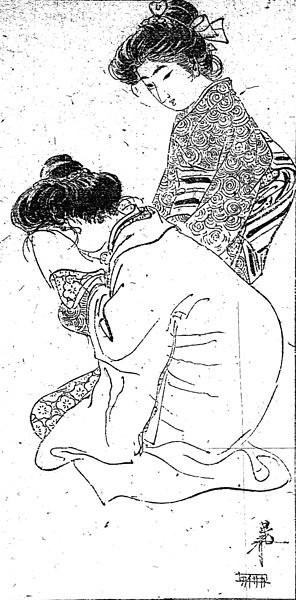 | 説明 | 地位も財産もある大家のお嬢様と、八年前に奥様が亡くなる前からこの家に同居している妾。今夜は密通を疑われた妾が主人からひどい折檻を受け、ふだんからこの女をよくは思っていないお嬢様が、取りなし顔で、じつは追い打ちをかけるような口ぶり。十九歳のお嬢様と三十一のお妾とでは着るもののちがいがそれほどないため、お妾だけに区別のため被布を着せたものだろう。被布は自分の手で水仕事をするような女性の着るものではないから、どちらかといえば暮らし向きのいい家庭で、子どもから老人まで羽織と同じように用いられた。また、日本髪とちがい、束髪は年齢や身分に関係なく結われた。その点で髪型の民主化とされるが、若い女性はリボンや造花など、飾りを豊富につけることで華やかさを添えている。(大丸 弘) |