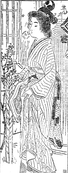 | 説明 | 浅草台地の芸者の出の姿。髪は芸者島田で帯は柳。有職風の柄の裾模様のきものを左褄にとって、右手で袖を抱えている。このきものは縞ではなく縞御召だろう。実際のきものではこんなに目立ちはしないのに、挿絵に描くとこうも描くことになる。御召も結城紬も縞が多いがそれを唐桟や弁慶縞のいわゆる縞の木綿のきものと一緒にはできない。絵画からきものの模様を読みとることは原則的には無理。薬指に指環を嵌めていて、芸者としてはこれはめずらしい。(大丸 弘) |