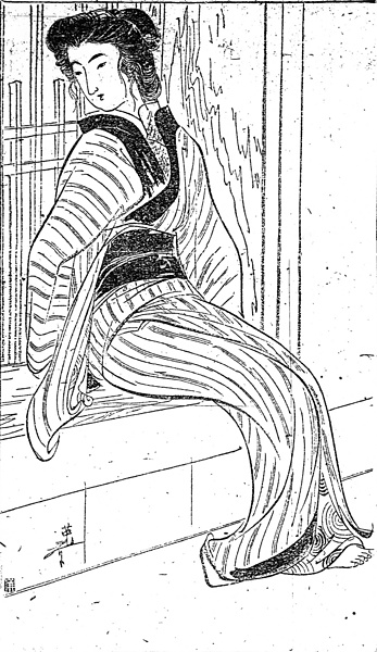 | キーワード | 銘仙の縞物;黒襟;腹合わせ帯;昼夜帯;帯締め;引っ掛け結び;ひっかけ結び;ふところ手;素足;肘掛け窓(ひじかけまど);千本格子 |