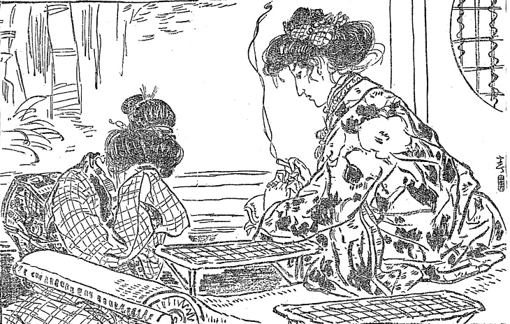 | 身装画像コード | D2hi:[束髪(庇髪など、後期平型の)] Wki:[喫煙関連;タバコ;キセル] Whan:[ハンカチーフ] D801:[強い悩み・悲しみ・口惜しさ・羞恥の表現] D2sim:[島田;高島田] D1ka:[髪飾り(櫛,簪,リボン)] Vhi:[被布] Vka:[掛襟] |