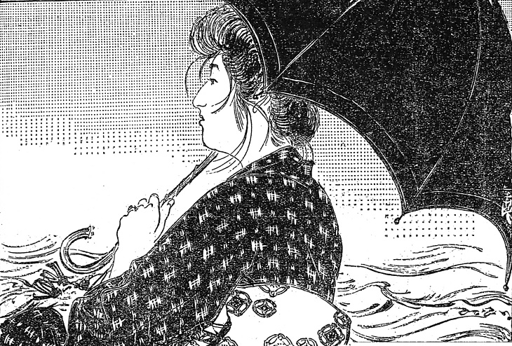 | 身装画像コード | D7sh:[小説のヒロイン;挿絵美人(この年の評判小説中の美人)] D005:[20~30歳代の女性;年増] D2hi:[束髪(庇髪など、後期平型の)] Qkas:[絣] Vob:[帯] Wkas:[傘] |