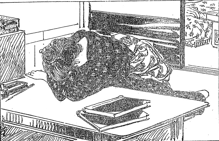 | キーワード | 襖(ふすま);机;帳簿;筆;玉簪;束髪櫛;紺飛白;唐縮緬の丸帯;お太鼓結び;突っ伏す;号泣する |