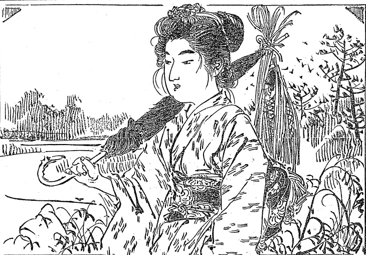 | 説明 | 豪雨のため霞ヶ浦が増水、氾濫し、別荘に滞在中の某華族の若様とお姫様の身も危険になったとき、十五になる漁師の娘がふたりの命を救った。そのお礼にと、別荘に招かれた折の娘のいでたち。「晴着と云っても洗い晒しの浴衣、厚ぼったい木綿地の帯を締めて、素足に突っかけの藁草履、老爺(オヤジ)の洋傘(コウモリ)の四つ手網にまがうのを借りて、其の先に苞(ツト)包みの鯉をぶら下げて、(気の)進まぬながら我が家を出た」とあるが、きものの着付けにはふつうの村娘町娘とも、べつに変わったところはなく、強いていえば帯幅の狭いくらい。十五という年なのでまだ肩揚げを持っている。右田年英の相変わらず浮世絵風の顔は、桃太郎のようにも見える。髪型はよくわからないが前髪と鬢(ビン=横髪)と髱(タボ=後ろ髪)の区別があるようなので、一応日本髪風。もちろん人の手を借りてなどいない髪だから、大きくは結えないし、形も歪んで左右不均整だろう。けれども東京のような大都会でも髪結の手にかかる人は半分もいなかったのだから、まして農漁村の女の髪は勝手気ままなもので、名前のつけようのないものだったことは確か。(大丸 弘) |