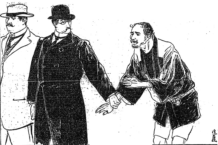 | 説明 | 外地で成功し、故郷仙台に錦を飾っている主人公とその同伴者。その同伴者に手首をつかまれているのは、駅頭でしつこく車を勧める老車夫。文中に「洗い晒の半天」とあるように、人力車の車夫は茄子紺の半纏に股引、饅頭笠という決まりがこの時代にはできていた。ただし盛夏にかぎっては膝丈の半股引を黙認すると。もっともこれは東京警視庁の条例であり(→年表〈現況〉1890年6月 「人力車夫の股引」東京朝日新聞 1890年6月20日4面)、その後も何回か注意が加えられているので、地方の状況ははっきりしない。とにかく明治の人力車夫というと、勧誘の強引さと不潔とで評判が悪かった。しかしこの挿絵で車夫の肩口に大きな継ぎの当たっているのは少しオーバーだ。主人が背広で、その従者がフロックコートという組み合わせは、身分の高い者はよりくつろいだ姿、仕える者はより慎みの姿と態度、という原則。レストランのウエイターの礼服と同様。なまじ整いすぎた恰好でレストランに行って、ウエイターと間違われる話はよくある。(大丸 弘) |