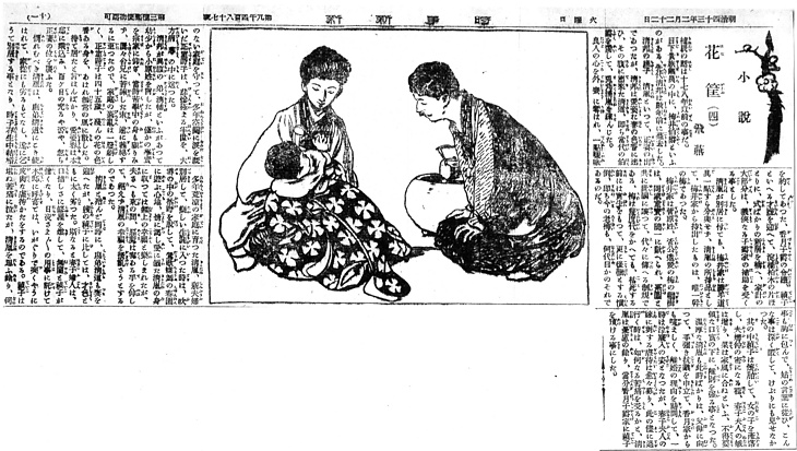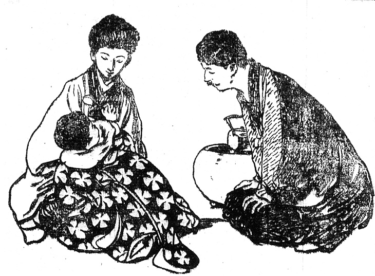 説明 物語は上流家庭のお家騒動。妾から後添いとなった義母に家を追い出された長男が、ある子爵家の娘と新所帯を持ち、生活費もその子爵家に依存しているという環境。2月末とはいえ、家の中で赤ん坊をねんねこ半纏でくるんで抱いている。 妻の羽織の袖や裾の丸みは綿入れであることを暗示している。とくに女性にとっての羽織は室内の防寒衣だった。(大丸 弘)