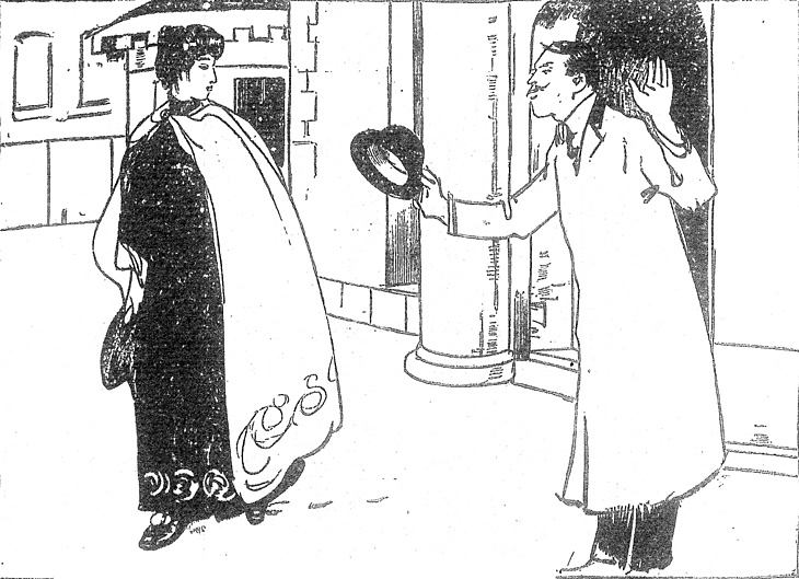| 説明 | 女優は大正期の新聞小説の重要なヒロインになる。この作品はその中ではもっとも先行例かもしれない。ただし、この時期の女優はまだ映画女優ではなく、帝劇女優の評判に便乗したもの。ここでの渡部審也の絵はかなりの略筆で、シンボリックとさえ言えそうだから、身装のあまり具体的な分析は無駄だろう。「黒い制服」とあるが、俳優学校に制服があったかどうかはわからない。上には引回しのマントを少し斜めにずらせて――ギリシャ風に――羽織っている。(大丸 弘) |
