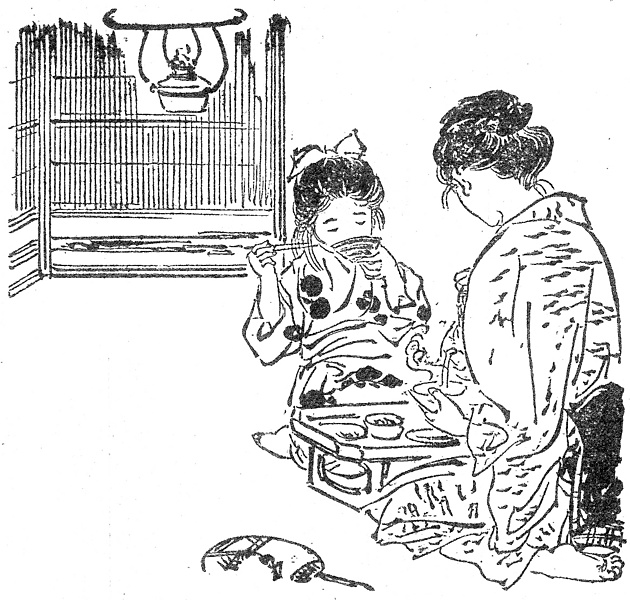 | 説明 | 母親と小娘が小さい飯台を挟んで食事している。母も娘もたぶん自分たちで結んだらしい、いい加減な頭の恰好。江戸時代以降この時代までは、風俗書などにはじつにたくさんの髪型がりっぱな名称付きで紹介されているが、たいていの女性は自分の手で不器用に、自分勝手にまとめていたはずだ。明治・大正になっても、商売人の手に任せる人など、十人に一人もなかったろう。(大丸 弘) |