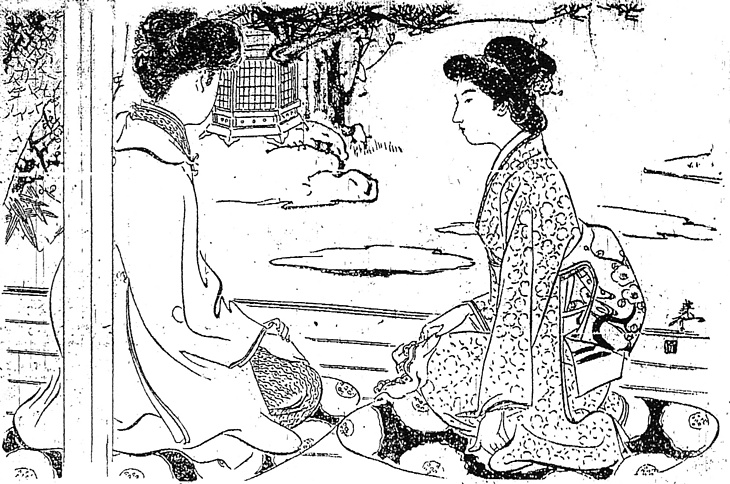 | 説明 | 軒先にアンティークな灯籠の下がっている縁先に端居しているのは、この家の主婦とその妹娘。姉は花のさかりの二十四歳で気品高い美貌の持ち主だが、出入りの商人などからは高慢な女ということで評判が悪い。彼女は廂髪(庇髪)(ヒサシガミ)で、細かい柄のおそらく小紋のきものの上に被布を着ている。見慣れないと外出着のコートのように見えるが、これは家の中でも外でも着られる、羽織のようなものだった。作者はその、高慢という姉に対して妹の方を、「廂髪の淺乃に対した彼女の温和(オトナ)しい島田髷は一層上品に見えている」と書いている。おそらくこれも現代の人の目から見ると反対だろう。廂髪はこの時期、女学生だけでないトップモードだった。(大丸 弘) |