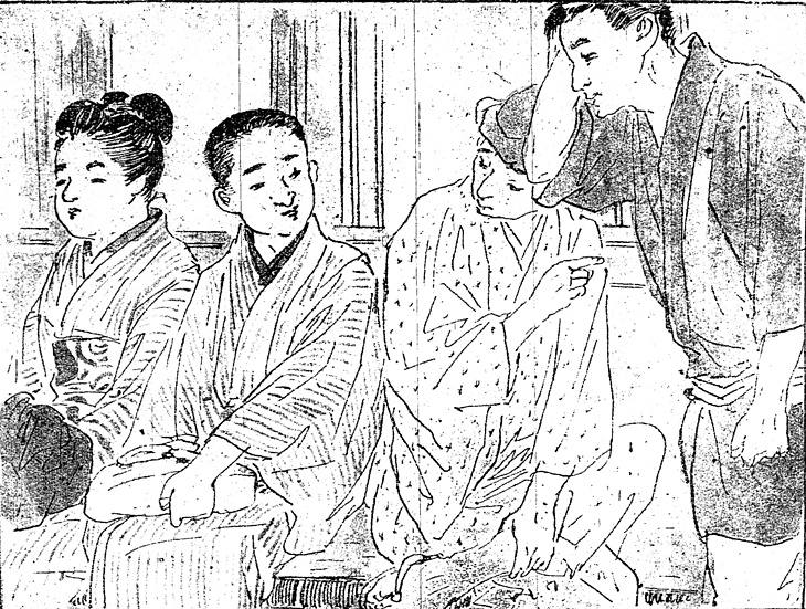 | 説明 | お盆の藪入りに実家に帰るため、市電に乗り込んだ商家勤めの姉弟。藪入りは正月十六日の方がよく知られているが、正月と、7月のお盆との二回あった。関西のお盆は新暦になっても旧暦の月遅れの8月が続き、ほかのこととちがってこればかりは関西の方が根強いようだ。数え十一という弟は、「黒っぽい手織縞の見るからに暑苦しげな格(ガラ)にない角袖を着て、小倉の帯をちょきんと結んで(……)」とある。ここでいう角袖とは丁稚小僧などがふだん着ている筒袖でない、袂の付いたきものという意味だろう。手織縞は故郷の母親の手紬手織とも思われ、呉服屋の商品とはちがう、丈夫でいくぶんゴワゴワした手触りのもの。この日に間に合うよう、仕立てて送ってくれたものかもしれない。その姉の十二の下女の結っているのは、「廻りの引詰めた風も格好もない頑固らしい銀杏返し」。銀杏返しはだれにでも、もっとも幅広く結われた髪だが、それにしてもこの年くらいがぎりぎりの下限だろう。(大丸 弘) |