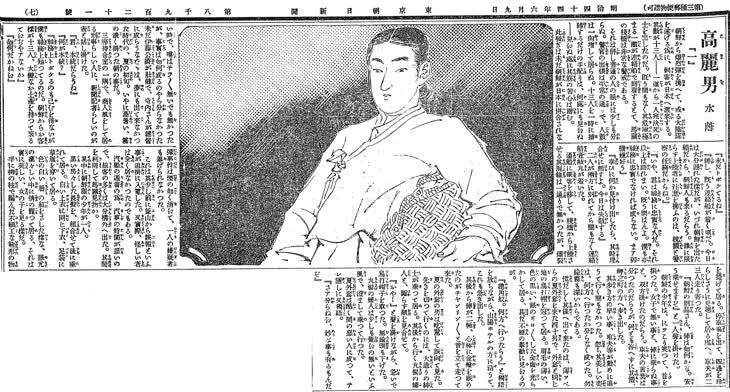 | 説明 | 韓国併合は前年8月のことで、早速、新聞小説には朝鮮ものが現れる。日清日露戦役で日本人は韓国と韓国人のことをあるていどは知っていたが、併合後はそれほど時をおかずたくさんの韓国人が日本に入ってきて、いろいろな面で好奇の対象になった。和服の改良のため朝鮮服を見習え、などというのもそのひとつ。ここでは、上衣(チョゴリー)、下衣(パチー)、足袋(ペスン)、草履(カックシン)が紹介されている。日本で朝鮮服というと、チマ・チョゴリの名はたいていの人が知っているが、それは女性服。(大丸 弘) |