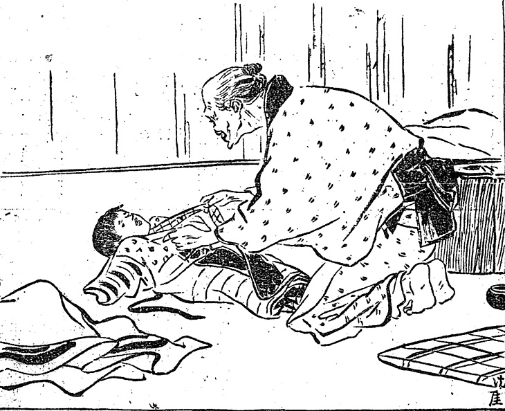 | 説明 | 当時、貧窮者を収容する施設だった養育院で生まれた主人公。そういう赤ん坊の世話は、耳の遠い婆さん一人の手に任せられているらしい。お婆さんは前頭部が禿げていて、それでも小さな髷を後頭部にチョコンと付けている。女性はこのように前の方が禿げることは少ない。とくに日本髪を結い慣れた女性は、根をかたく締めるため、頭の頂点辺りの毛根を傷め、河童のような禿げになる人が多かった。(大丸 弘) |