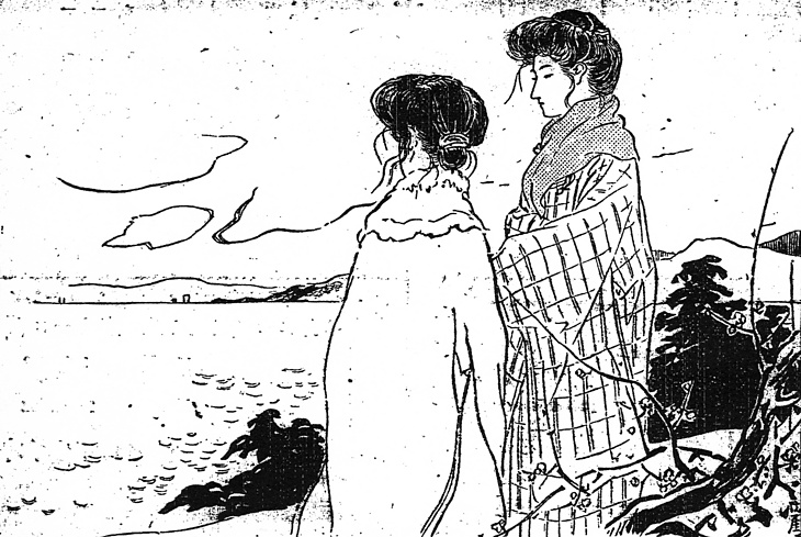 | 説明 | 先妻の子に嫁いできた嫁を嫌う姑、その姑の実子である心優しい小姑。小田原近辺の海を見晴るかしている二人の女は、産後の肥立ちが悪く、ようやく回復した兄嫁と、それに付き添っている義理の妹。説明は「いずれも束髪で」だけですましている。二人の髪がまったく同じかどうかはわからないが、手前の妹の方は、一度てっぺんで結んだ髪を、うしろの方へもってきて、うなじのあたりで丸めて櫛を挿しているよう。変わった髪だが、こうした小さな変化や工夫にいろいろな名称がついて、新聞で紹介されたりした。しかしいずれにしろ髪を見ただけでは、子持の女と、結婚前の妹との区別がつかない。それを世も末のように嘆く人もすくなくなかった。(大丸 弘) |