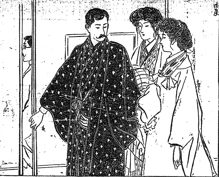 | キーワード | 八字髭;紺飛白;羽織紐;上襟;リボン風の胸飾り |