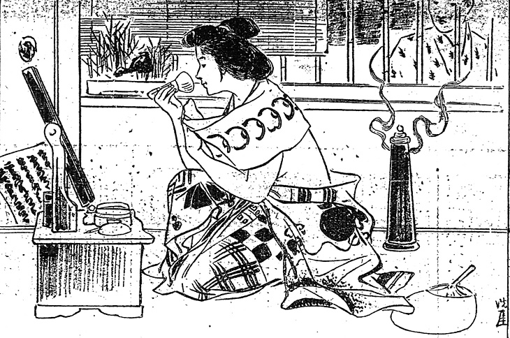 | キーワード | 大肌脱ぎ;濡れ手ぬぐい;立て膝;鏡台;牡丹刷毛;化粧ブラシ;蚊燻し(かいぶし);うちわ;座布団;格子窓 |