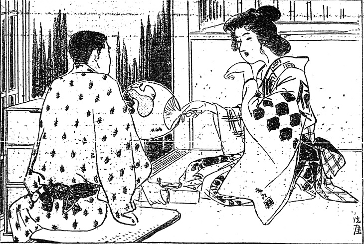 | 説明 | 第6回はお弟子さんたちの来るまでにサッと行水を浴びて、大肌脱ぎになっていま牡丹刷毛を使っている。粋を売物にする種類の女は襟白粉を塗るので、どうしても肌脱ぎにならなければならない。濡れ手拭いを背中に当てているのは余分の白粉を拭きとるため。そばに奇妙な形の蚊燻しがあるが、下町の職人たちは夏のあいだ蚊が多くて仕事にならず、それで稽古場出入りをする連中を蚊弟子などといった。暑いあいだは師匠連の稼ぎ時だった。その若い師匠が、化粧をすませて来客をもてなしているのが第7回。師匠の結っている髪は島田で髷はけっこう高い。帯はたぶん引っ掛け。こうした稼業の女が、家でお太鼓結びに結んだりしたら、かえっておかしい。(大丸 弘) |