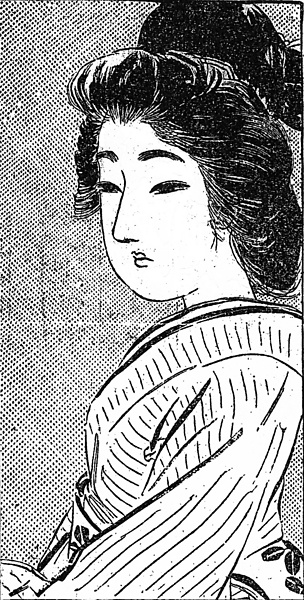 | 説明 | 職人たちの噂の対象になっている下谷芸者。「すばらしい別嬪の上に、立派な華族や紳商連が、盛んに競争」しているという売れっ子。頬のふっくらした瓜実顔の美人で、額のひどく狭いのがこの時代の美人の特色。芸者のお座敷の髪は島田にきまっている。挿絵を描いた井川洗厓はなぜか鬢(ビン=横髪)のあたり、すこし癖ッ毛のように描いている。天然ウエーブのある毛を持った人は日本髪では厄介で、油をたくさん使って、隠すのに苦労した。(大丸 弘) |
