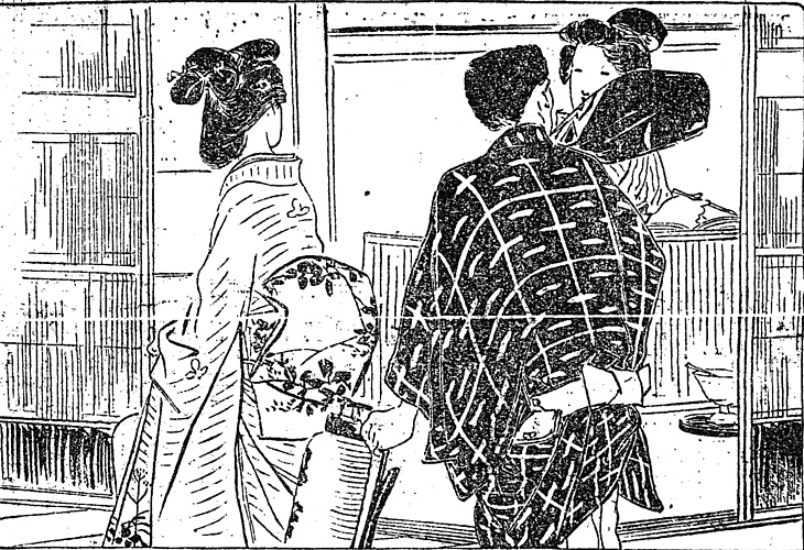 | 説明 | 本文の内容と挿絵とはずれていて、描かれているのは呼ばれた芸者が料亭のお内証で挨拶し、これから上がってお座敷に向かうところ。芸者の衣裳は、「秋草の裾模様ある絽縮緬の紋付、銀紗に宮城野の萩を透かした帯」とある。芸者の衣裳はお座敷での話題の提供、ということもあって、心遣いが必要だった。芸者置屋の名の入った提灯を下げ、三味線を担いでいるのは芸者屋の若い衆で、箱屋と呼ぶ。尻を端折って、角帯を小粋な神田結びかなにかにしている。芸者や幇間(ホウカン)はお客ではないから料亭の玄関からは入らない。(大丸 弘) |