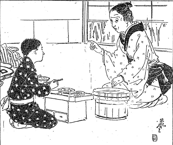 | 説明 | この時代の庶民はまだ箱式の飯台を使っていた。図のように下が引き出しになっているものもあったが、ふたをひっくり返すとお盆の役をする単純な蓋式の物が多い。大人だとかなり低いので、正座だとどうしても前屈みになって食べるようになる。(大丸 弘) |