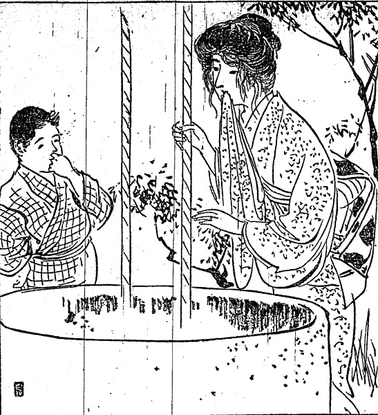 | 説明 | 村の貧しい家の子と、お邸のお嬢様。お嬢さんは手水(チョウズ)を使うため縄釣瓶で水を汲み上げている。袂が邪魔でもあり、濡れるのを防ぐため口にくわえている。小川の流れにちょっと手を入れるときなど、小腰を屈め、少し身体を捻って袂を口にくわえるのなど、ポーズとしては悪くないが、それより帯に挟む方が実際的。お嬢さんはいま起きたばかりとも見えないが、束髪の後れ毛が顔にかかりすぎている。毛が多く、また毛の硬いたちの人は、束髪にするとこの落ち毛の始末に悩まされた。(大丸 弘) |