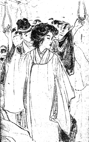説明 ヒロインは「一張羅の着物と羽織を半コートに包んで、白い絹ショールを風に煽られ(……)」という姿で電車を待っている。満員電車で押し押され、それがこの日の話のほとんどだが、挿絵ではゆったりと立っている。ヒロインの着ているコートは被布襟のコートで被布ではない。しかしどっちつかずのような折衷型も、呉服屋やデパートの新案に次々と現れていた。きっちりと合わせた襦袢の襟元に、連珠風の襟留めが見えるようでもある。この時代の束髪は形がくずれて、一種ソバージュなものが現れだしている。この女性の髪もその一例といえよう。(大丸 弘)