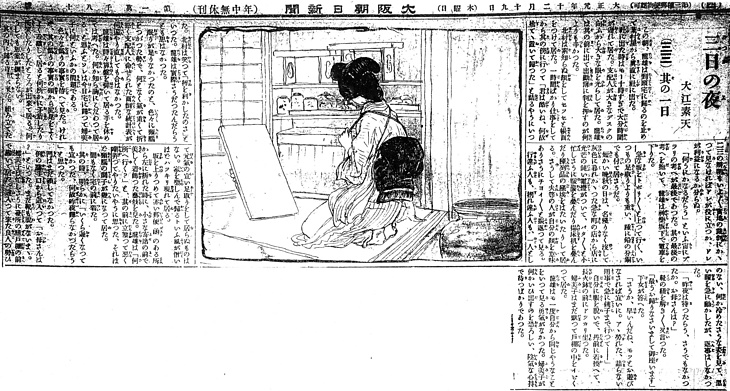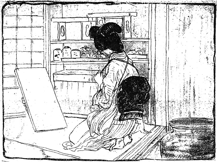 説明 各家庭に水道のまだ来ていなかった時代は、台所の大きな水甕(ミズガメ)が目を引く。水甕の置いてある土間から、小さなひとまたぎ上がったところが、台所の膳戸棚の前の板の間だが、挿絵では畳を敷いているようにも見える。主婦と女中の主な仕事場がここで、丸髷の主婦は襷掛けで前掛けをし、身体を少し倒して片手を突いている。そしてやや傾けた頭に、一種の感情を表現している。(大丸 弘)