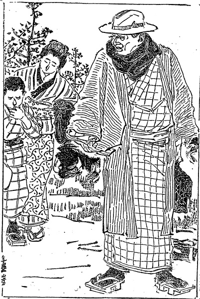 | キーワード | 金融業者;中折帽子;中折れ帽子;竪縞のきもの;竪縞の羽織;黒い襟巻;羽織紐;兵児帯;紺足袋;書生下駄;革かばん;鰐皮の手提げかばん |