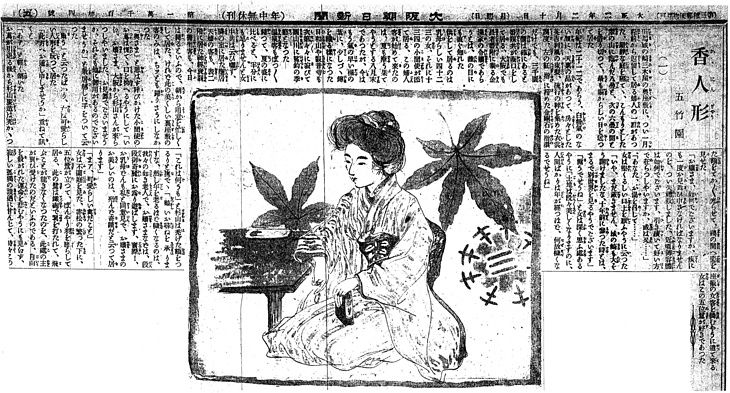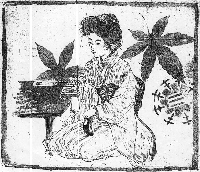 説明 大阪の分限者の中でも指折り数えられる家の一人娘、五年前に婿を取ったが、母親との折り合いが悪く、男の子一人を儲けながら婿は去ってしまった。今年まだ二十一,二という歳。「房々とした英吉利風の束髪」とあるが、束髪も明治中頃のものとこの時代のとではすっかりちがっている。イギリス巻というスタイルは、束髪が最初に導入されたときに、上げ巻・下げ巻・マガレートとともに入ってきた古い形。しかしこういう名称はすべて髷の形につけられているので、髷の見えない前方からではあまりよくわからない。いわゆる二百三高地以後、髷が高く突出したスタイルが一部に流行して、この女性の髪もその一例。袖口から引きだした襦袢の袖を咬んでいるのは、悲しみや悔しさの強い感情をを表すしぐさだが、ここではあまりピンとこないし、穏やかな表情ともそぐわない。(大丸 弘)
