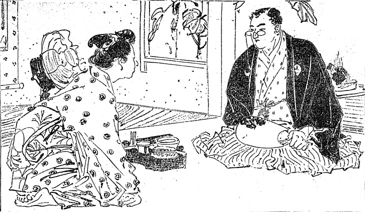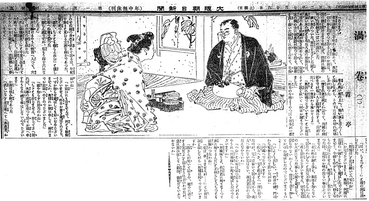 | 説明 | 多作家だった渡辺霞亭の作品中でももっとも人気の高かった作品で、タイトルを借りた髪型がたくさん流行した。それには右田年英の、脂がのった挿絵がみごとだったためもあるかもしれない。床の間に、一部の余裕のある家で使いはじめた扇風機が見える。この頃は床の間に置いている家が多かったようだ。(大丸 弘) |