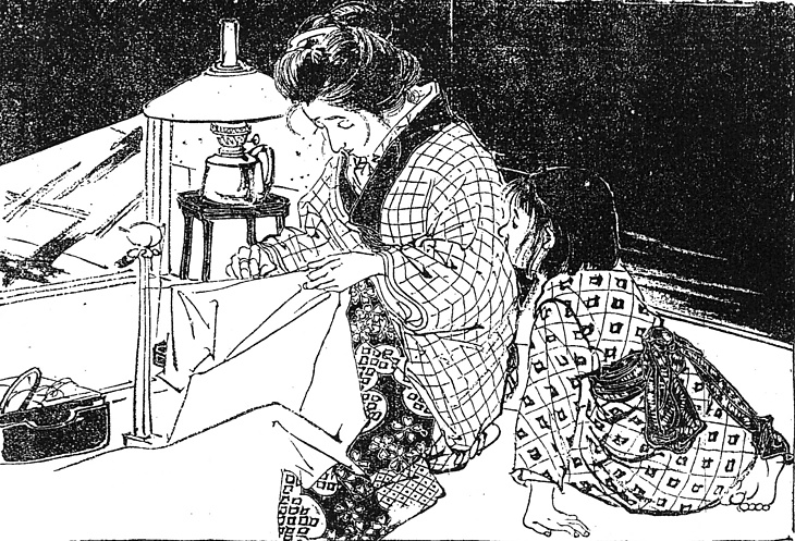| 説明 | 小さい娘の晴着を拵えてやるためにも、夜なべの賃仕事に精を出す母親。それをのぞき込んでいる娘。ランプが手暗がりになるところに置かれているのは、絵の構図上やむを得ないのだろう。娘は母親を乳母と呼んでいる。この時代の家庭小説には多かったややこしい肉親関係。(大丸 弘) |