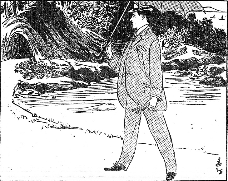 | 説明 | 学校を出たあと併合後間もない朝鮮へ渡って、多少の財産を作った三十二歳になる男、きょうは学生時代の友人を訪ねるため千葉県の辺鄙な土地に足を入れた。生憎道路工事中だったので、かなりの距離が徒歩になった。蝙蝠傘を日傘にして、夏の日盛りの道を歩くにしては背広の上着も脱いでいないのは不自然。洋服のカジュアルな着こなしが、まだ日本人には学習されていなかった。それ以外は、スーツスタイルとして現代とちがう点はない。男が日除けの蝙蝠を挿すのは、どちらかといえば関西の習慣。(大丸 弘) |