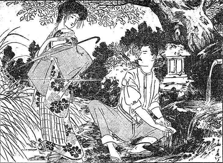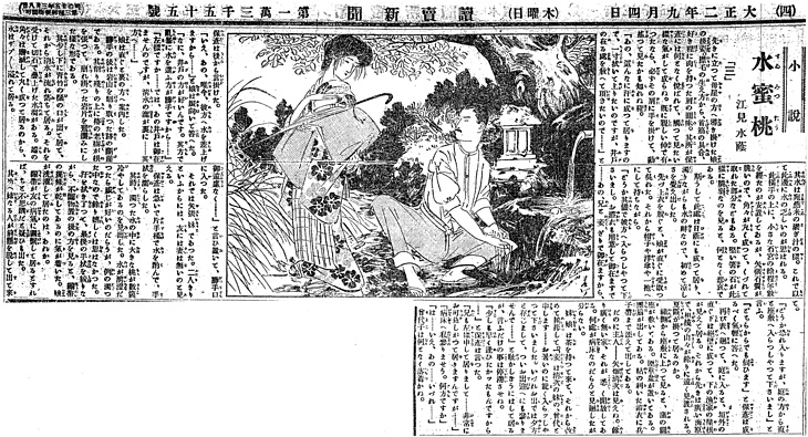 説明 [読売新聞]の挿絵は、梶田半古、鏑木清方のあと、石井滴水が長いこと担当しているが、この作品は宮川春汀。忠実に説明的な挿絵だが、絵が稚拙であるのは仕方がないとして、浮世絵系の画人の中にはどうしていつまでも、こうした決まりきった、いい加減な狐のような人の顔を描き続ける者がいるのだろうか。挿絵は芸術でないのか、本絵画家と比べて挿絵画家はなぜ低いものとされるのか、という反発や議論がやがてさかんになるのだが。(大丸 弘)