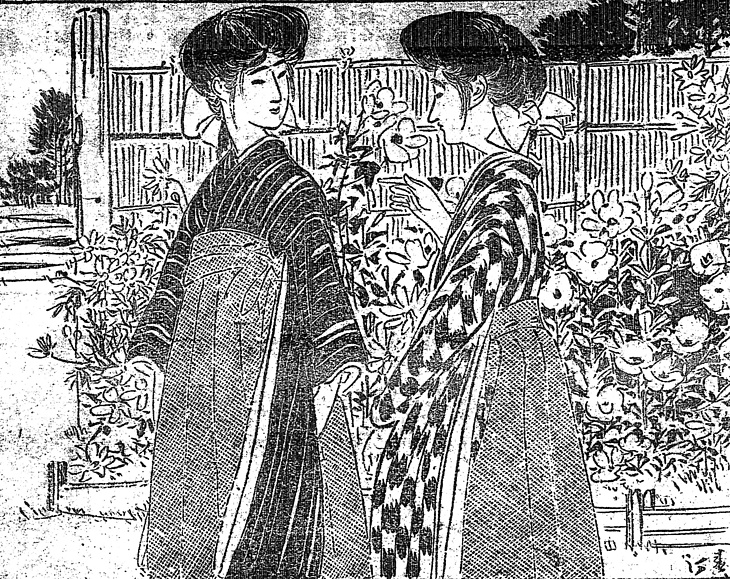 | 説明 | 私塾で学んでいる二人の女学生。廂(庇)(ヒサシ)が大きく突き出ている。右側の女性の突き出し方くらいが限界だろう。束髪は例によって後れ毛が頬や首筋にかかっている。確かに単純な束髪の方の場合、ある程度の後れ毛の存在が自然な風情を添えるものである。襟袴の穿きようなど、身装の分析のためには、挿絵にはもう少しリアリティーがほしい。(大丸 弘) |