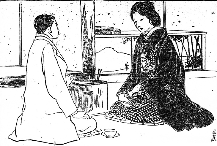| 説明 | 出獄した待合の女将に忠告するため、かつての婚約者である研究者が訪れた。どういう手ちがいか、女将の座高が10センチほども高いので、奇妙な画面になっている。女将は胸を詰め、襟を抜いたきものに幅広い掛け襟をしている。襦袢の襟には襟留めが見える。膝の上の刻み入れから、小さな煙管に煙草を詰めるしぐさで、客の硬い態度に比べ、かなり気楽そうだ。女の髪は出所したばかりだから簡単に横で丸めているだけ。眉を落としているのは、芸者の女将で人の妾、というややこしい身分のせいか、あるいは歳に合わせたのか。(大丸 弘) |