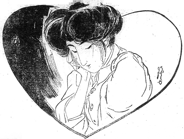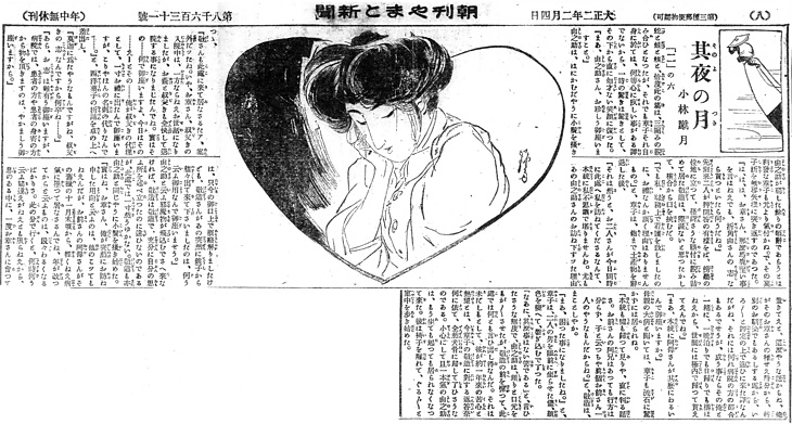 説明 錦絵風にいえば大首絵。朝、新聞を開いた読者はギョッとするかもしれない。ヒロインの看護婦を紹介するのが連載第1回の主な目的にしても、画面の上半分を顔が埋めているのは大胆な構図。よく見るとこの女性はウエストのベルトから顎までのサイズと首から上のサイズがほぼ均しく、そのことに気付くとだんだん不気味になってくる。また看護婦の制服を描いている筆のタッチの荒さや、日本画風の打ち込みも気になる。女の顔は常套的な美人顔だが、まっすぐに通った鼻筋に比べて、鼻の先や小鼻の表現が観念的で醜く、この時期の日本画家のデッサン力を暗示している。束髪はこの頃から、梳き毛を入れてもっとも大きい時期になる。束髪は油をあまり附けないので後れ毛が顔にかかることが多く、それを束髪の欠点と指摘する人もあった。(大丸 弘)